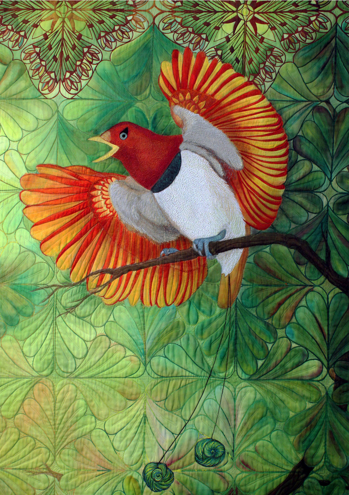 Size: 63" x 69" This species thrives in the lowland forests of New Guinea and nearby islands. The male and female are extremely different in their coloring. Females are shades of brown, while the male is exotic. His bright red head, colorful wings, iridescent collar and white breast demand attention. The male performs an extraordinary courtship display, as he puffs up his body, flaunts his wings, and shows off his two long tail feathers that end in circles of emerald green. Watching videos from Cornell Lab of Ornithology and the Smithsonian Channel, we laughed as the females expressed a mixture of wonder and confusion, as the male dances. Designed and created by Susan Ennis and Ginny Eckley on cotton fabric. Printed using silkscreens of our design, hand painted and embroidered. Work completed in 2015. This artwork is currently on display at Creativity Shell in Kingwood, Texas. |