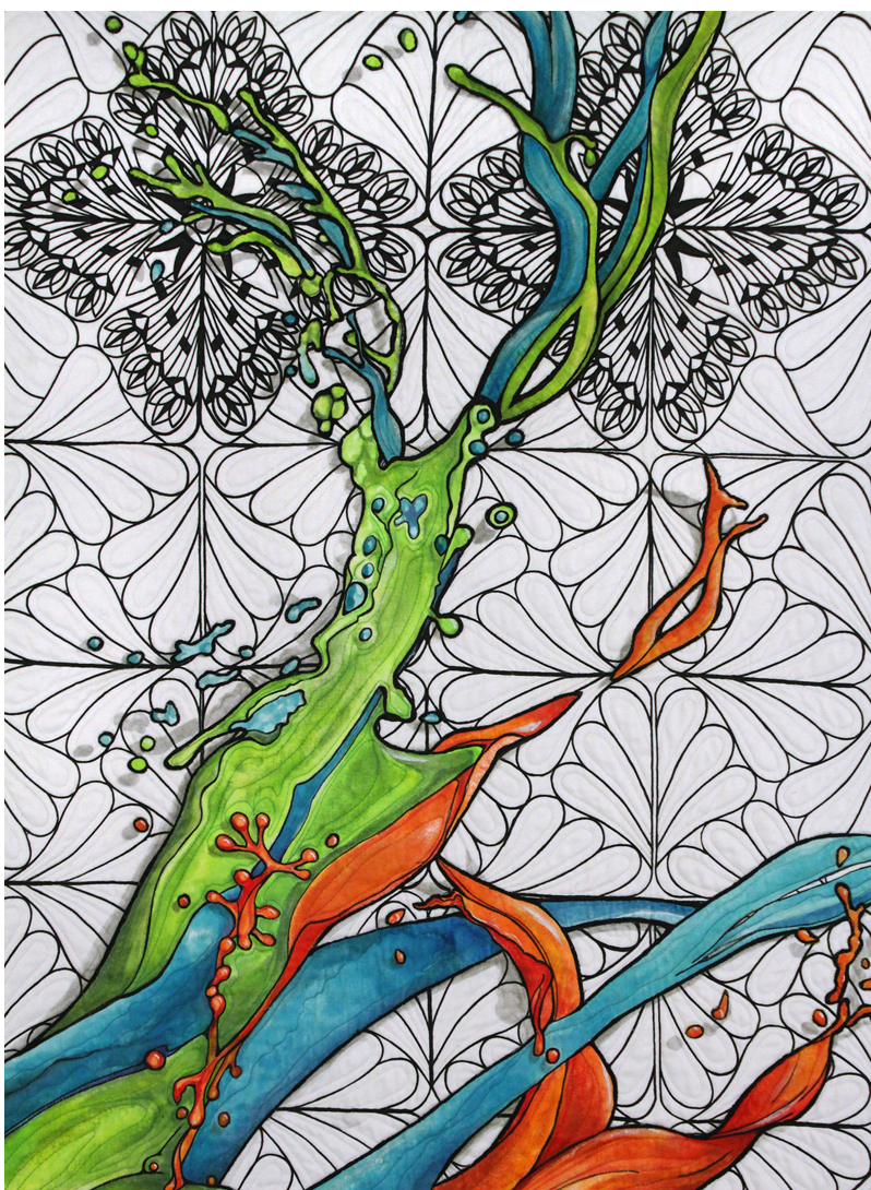 Size: 70" x 76" Inspired by fields of flowers at dusk, artists Ginny Eckley and Susan Ennis chose turquoise tones for the background of their third quilt. Using silkscreen designs, each section is printed and painted, multiple times. Pearlescent paints and layers of color give depth to convey flowers in full bloom at dusk. This artwork is currently on display at Creativity Shell in Kingwood, Texas. |